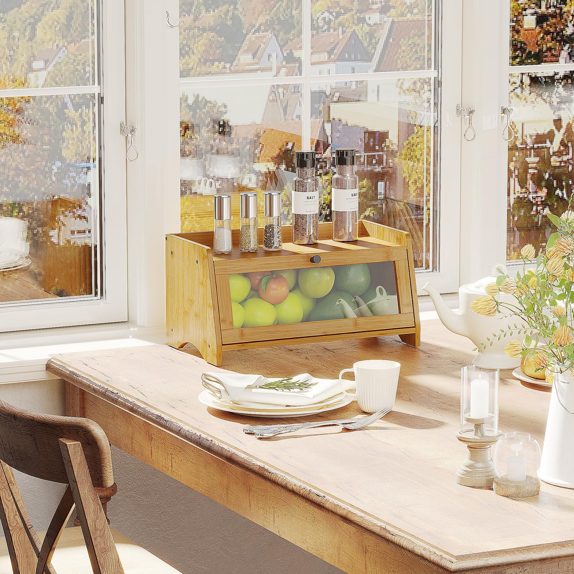 [Premium Bamboo Bread Keeper] Crafted from eco-friendly bamboo with a durable matte black finish, this bamboo bread box features a scratch-resistant acrylic window for quick visibility. Stores artisanal breads, cheeses, and baked goods while complementing modern kitchens.