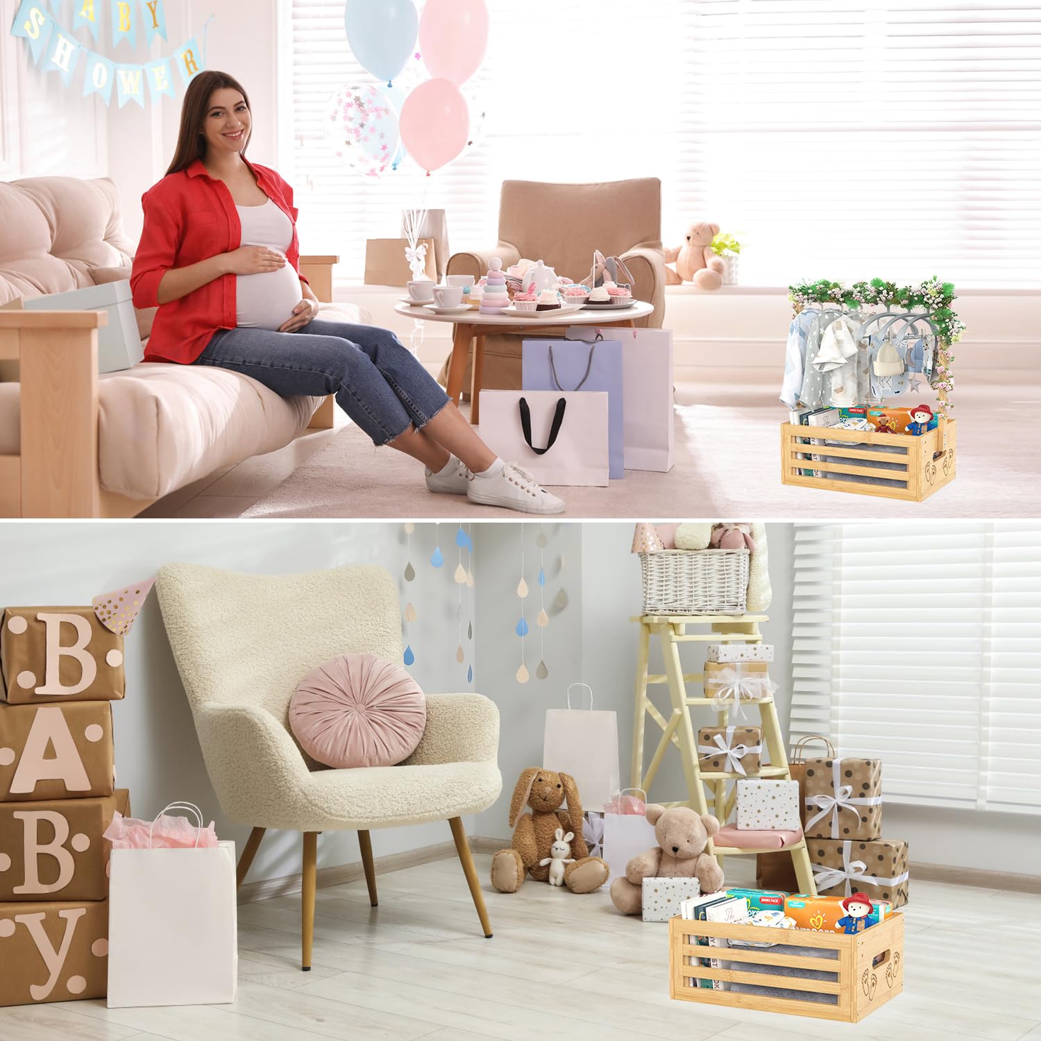 - Reliable Material: This baby shower crate with hangers bar for crafts and letters decorations are made of quality solid bamboo material, safe, sturdy and reliable, without any burr, won't hurt you and your little one's hands, and the bamboo panels on both sides are designed with baby feet hollow patterns, making it more unique. This baby gift basket is not only practical, but also a art