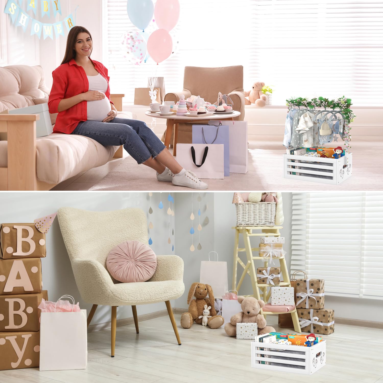 - Dual Function: This small shower party basket with handle offers dual functionality of storage and hanging. Compared to other gift containers that only provide storage, our baby shower crate box comes with a spacious crate and hanging rack, enriching the display form, making it a practical and stylish choice